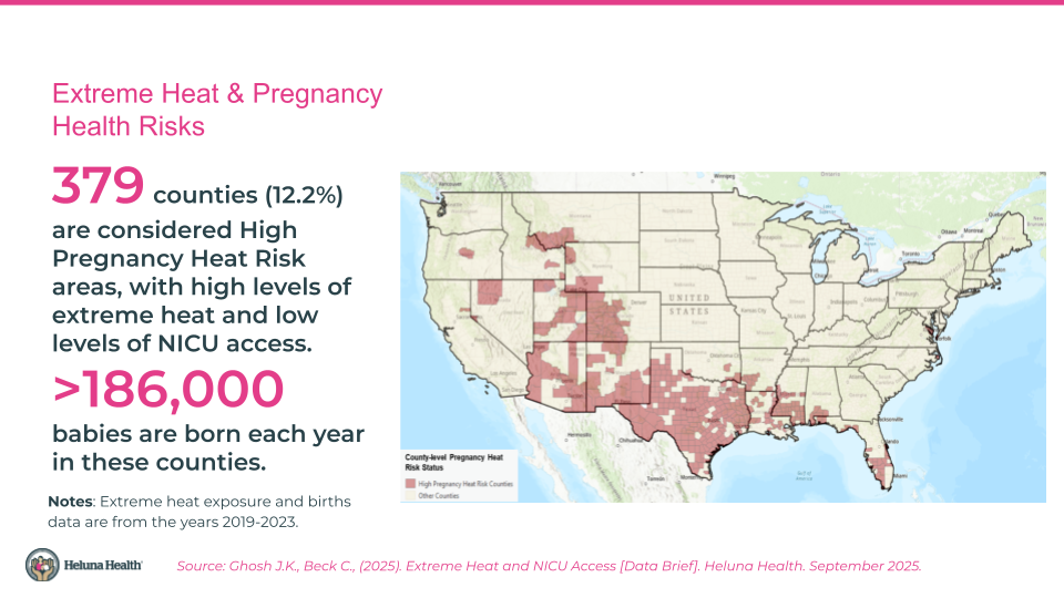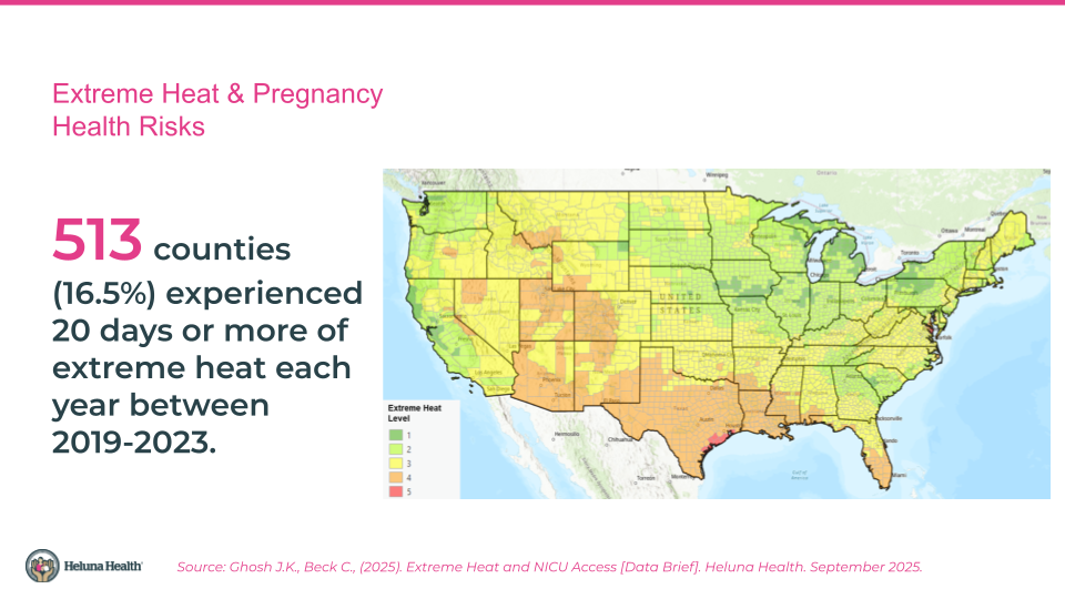 Climate change is increasing the frequency, severity and geographic impacts of extreme heat events [1]. Extreme heat days are typically defined as days with hotter and/or more humid weather, compared to normal; definitions can vary based on temperature alone or the heat index (a combined measure of temperature and humidity) [2-4]. In early summer of 2025, a heat dome brought dangerous levels of heat across many parts of the United States, with over 100 million people exposed to extreme heat during each day of that heat wave [5]. These types of heat events can cause especially serious health problems for pregnant women and their babies.