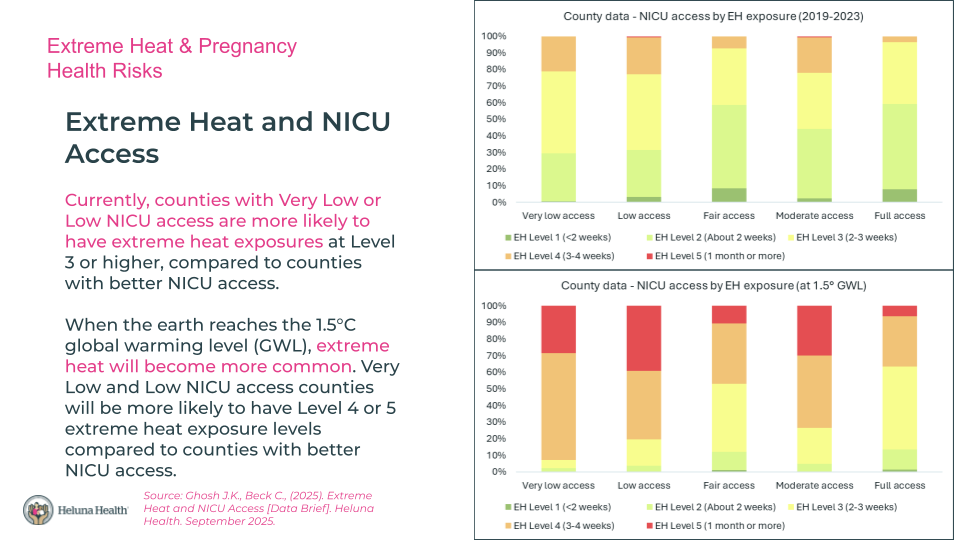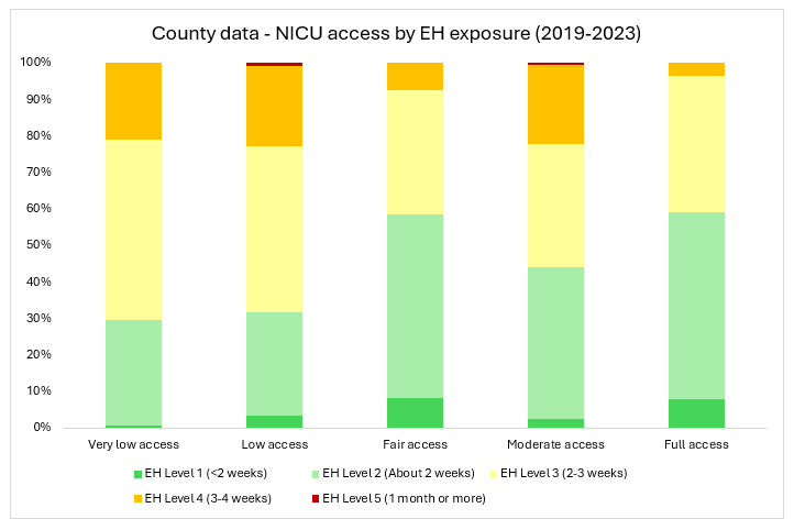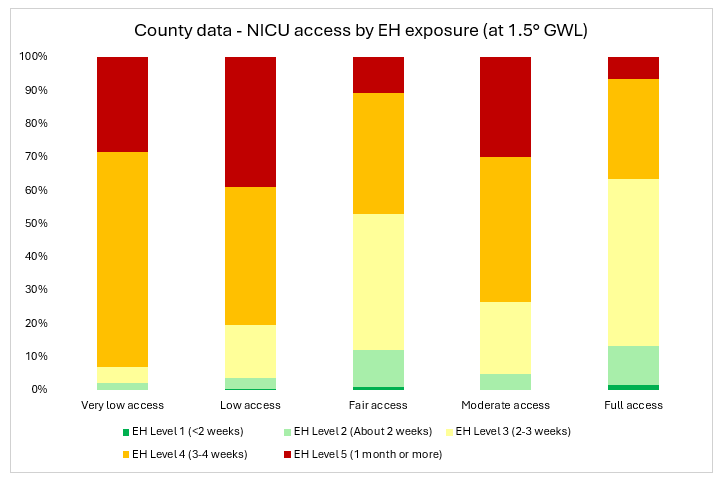 - Current Extreme Heat Exposures and NICU Access: Counties with Very Low or Low NICU access were more likely to have extreme heat exposures at Level 3 or higher, compared to counties with Fair, Moderate, or Full NICU access scores.