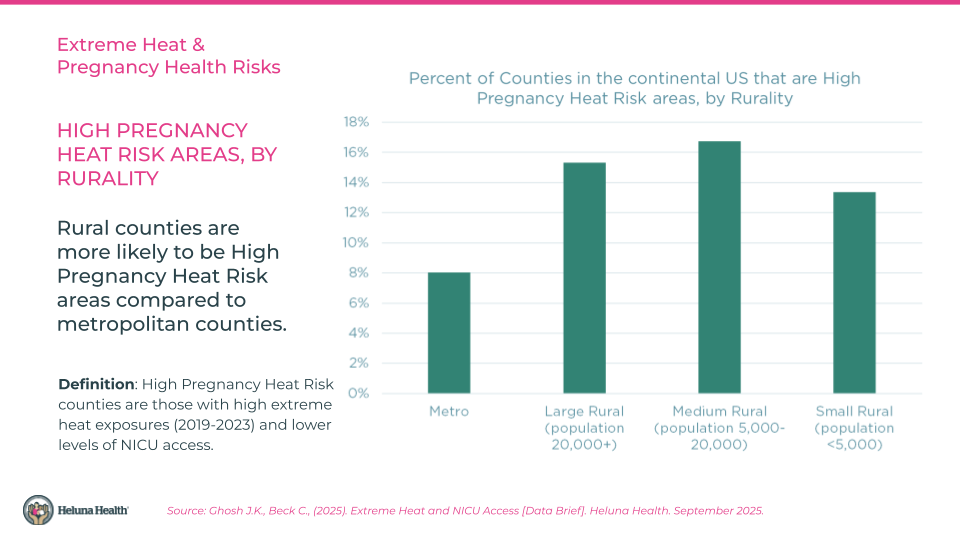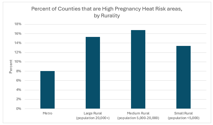 - Rural counties at higher risk: Rural counties are more likely to be located in High Pregnancy Heat Risk areas compared to metropolitan counties. The proportions of rural counties that are High Pregnancy Heat Risk counties range from 13.4% to 16.8%, compared to 8.1% of metropolitan counties.