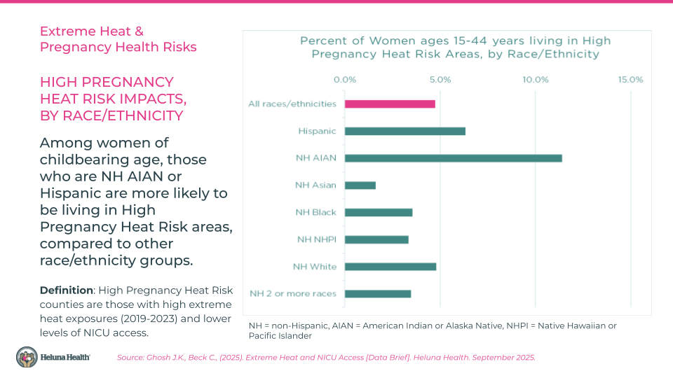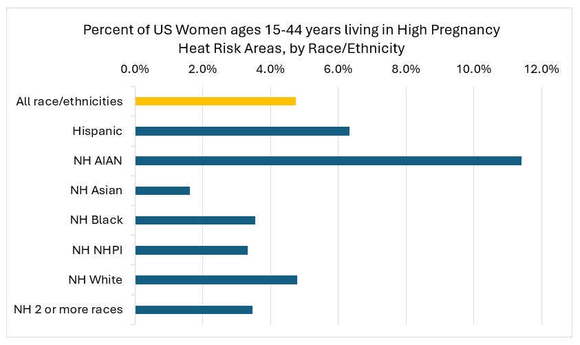 - Racial disparities in pregnancy heat risks: More than 11% of NH AIAN women ages 15-44 live in High Pregnancy Heat Risk areas. More than 6% of Hispanic women and nearly 5% of NH White women ages 15-44 live in High Pregnancy Heat Risk areas. Between 3-4% of women identifying as NH Black, NH NHPI, or NH of two or more races live in High Pregnancy Heat Risk areas, and less than 2% of NH Asian women live in these high risk areas.