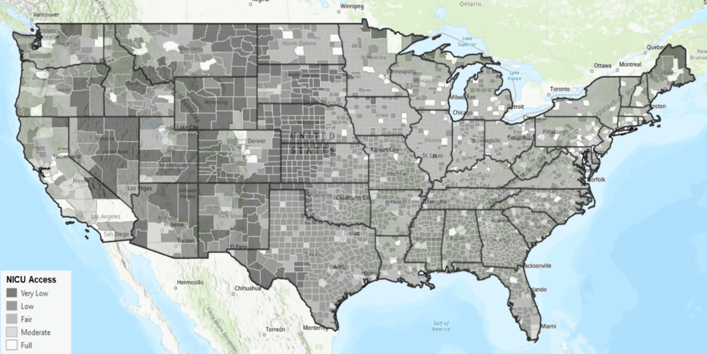 NICU data: The dataset of NICU facilities was restricted to Level III and IV facilities and cleaned to remove duplicates and correct addresses for geocoding. Records were geocoded using Google Sheets Awesome Tables, and ESRI ArcGIS Pro was used to identify the county in which each facility is located and calculate distances from county centroids, using the NAD 1983 (2011) Contiguous USA Albers projection. NICUs located at military hospitals were included in the dataset, as these facilities are typically located in areas with a large number of military families who would likely use such healthcare services.