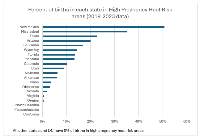 - States with the highest proportion of births occurring in High Pregnancy Heat Risk areas: There are 9 states that have 10% or more of their births occurring in High Pregnancy Heat Risk areas. These states are New Mexico (50.7%), Mississippi (35.0%), Texas (22.5%), Arizona (20.0%) Louisiana (16.7%), Wyoming (14.5%), Florida (13.6%), Montana (13.3%), and Colorado (10.1%). These are the geographic areas where heat illness prevention among pregnant people is widely needed.