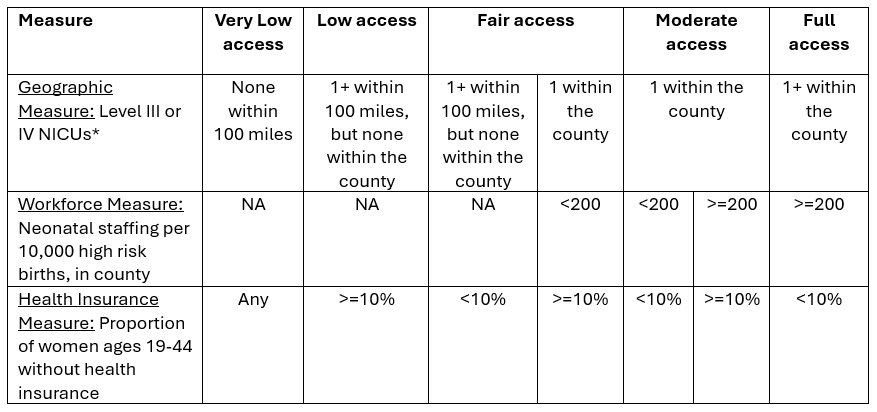 To assess availability of NICU services, we developed a NICU Access Score, which included measures of facility locations, neonatal staffing availability, and health insurance (Table 2). Together, these measures reflect geographic accessibility, workforce availability, and financial accessibility of NICU care. This scoring system was loosely modeled on the Maternity Care Deserts indicator scoring, which focused on obstetric care [18].