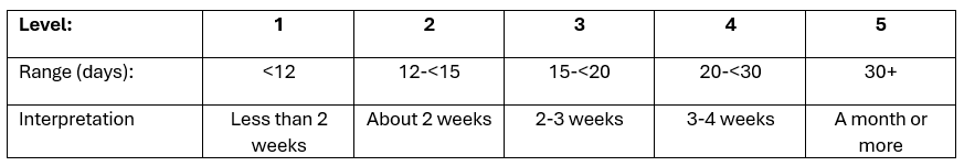 We defined current extreme heat exposures based on the annual average number of days from 2019-2023 with a Heat Index above the 95th percentile for that county, compared to a baseline time period (1981-2010). We categorized extreme heat exposures into 5 levels, defined in Table 1.